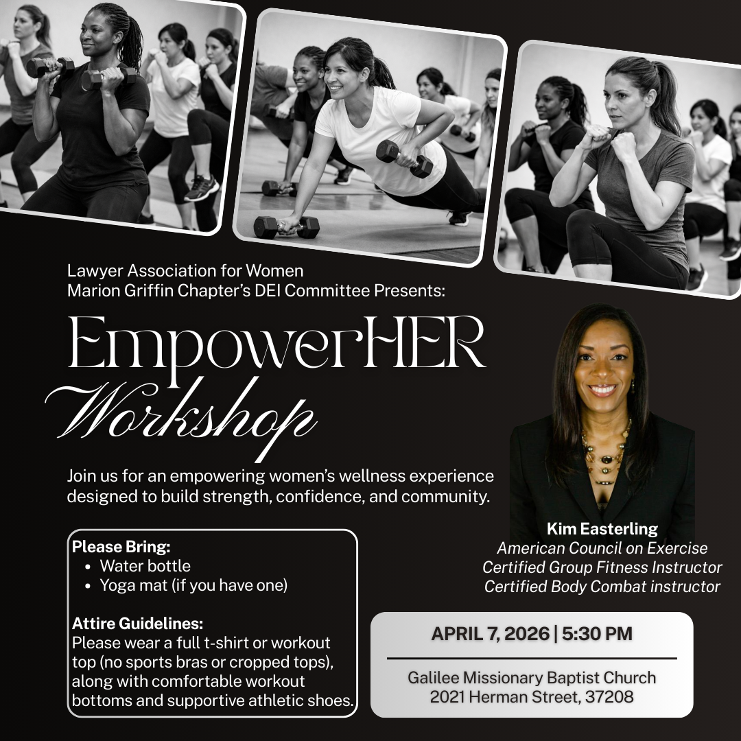 Join us for the EmpowerHer Workshop on April 7th – a women’s wellness experience designed to build strength, confidence, and community. We are thrilled to welcome ACE Certified Fitness and Body Combat Instructor, Kim Easterling, to guide our group through a wonderful workout designed for women who want a break from the battles of life.